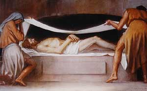 De acuerdo a las costumbres judías y según los Evangelios, el cuerpo de Jesús debió quedar tendido en el sepulcro preparado por José de Arimatea y la postura de las manos sobre la región pélvica, coincide con los enterramientos hallados en Qumrâm por el padre De Vaux de la Escuela Bíblica. No fue el cumplimiento de la práctica judía la preocupación principal, lo demuestra el mismo Sudario, donde ha quedado a imagen del cuerpo, el cual no fue lavado según la costumbre y la Ley, aunque sí ungido con grandes cantidades de óleos costosos y rápidamente amortajado.