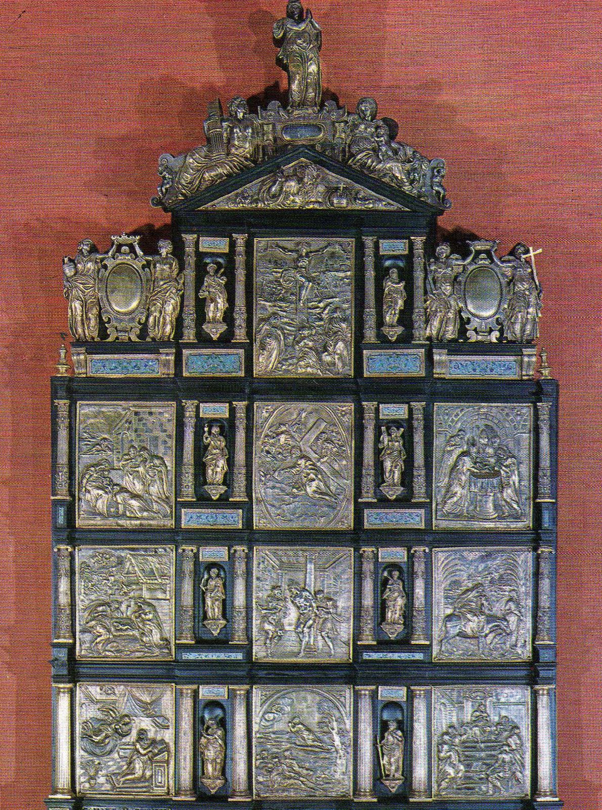 Cinco grandes obras de Juan Fernández de Navarrete San Jerónimo en penitencia, La Flagelación del Señor; Martirio de Santiago apóstol; Sagrada Familia y el Nacimiento del Señor. En el testero menor, hay un altar portátil del Emperador Carlos V, que llevaba en sus campañas, el cual es de bronce y plata con esmaltes. El muro e la izquierda, se adorna con pinturas que representan a San Pedro; La Asunción y San Agustín, de Bartolomé Vicente. Cristo muerto; San Jerónimo (de Matías Torres), una Dolorosa de escuela italiana y la Sagrada Familia con San Juanito, también de escuela italiana.